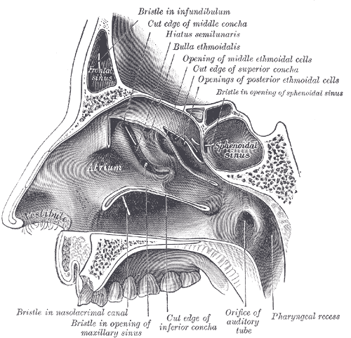 På sistone har jag uppmärksammats på näsans anatomi, och hur utrymmet innanför näsan är så mycket större än den del av näsan som sitter på ansiktet (se bild). Det finns enormt mycket utrymme bakom och uppåt i näsans anatomi och om man tänker att luften ska släppas in och upp i det utrymmet så tar man bort det där med att "dra ner luft" i lungorna. Luften ska inte dras in. Och definitivt inte ner! Den kommer dit naturligtvis, men vi behöver inte styra den dit.